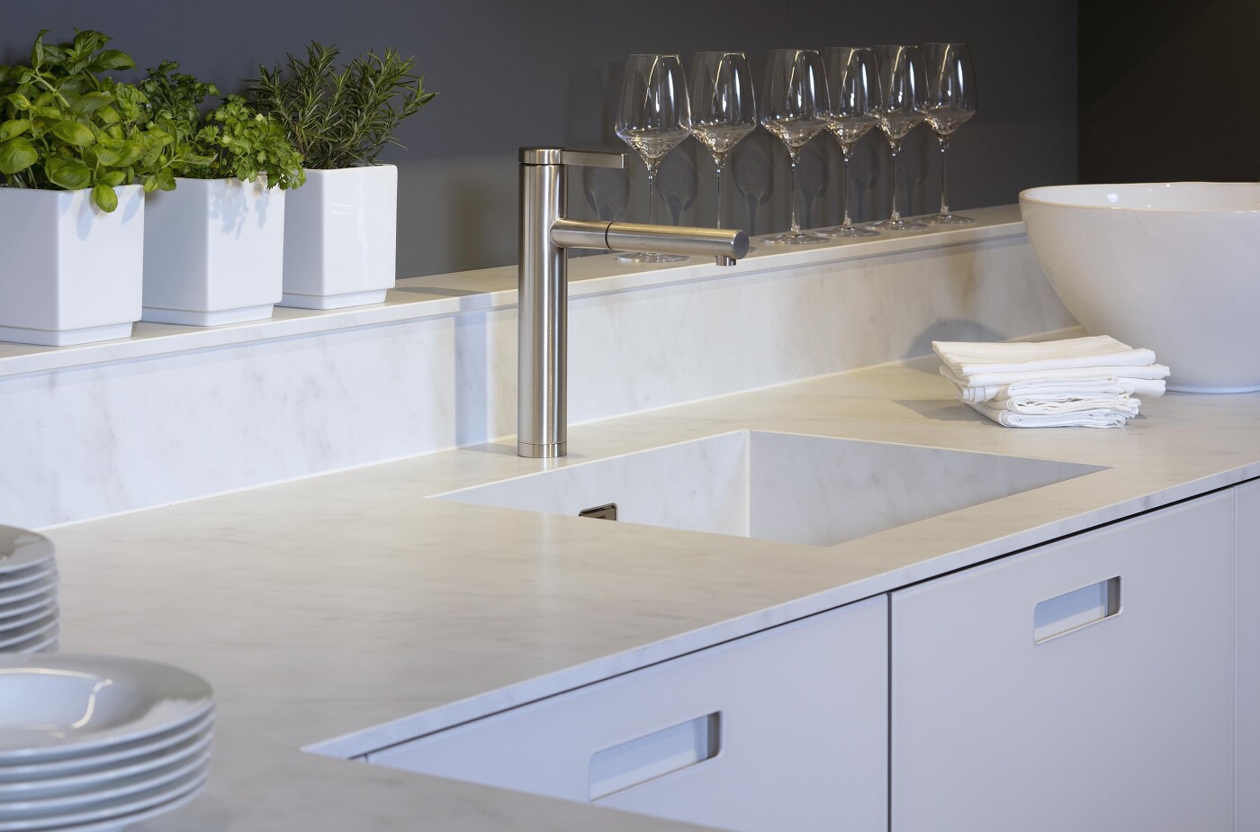 Vielleicht ist es Ihnen schon in der ein oder anderen Einrichtungszeitschrift oder in einer Küchenausstellung aufgefallen: In Designküchen wird häufig darauf verzichtet, die Arbeitsplatte über die Küchenunterschränke überstehen zu lassen, besonders häufig dann, wenn extradünne Arbeitsplatten verwendet wurden. Das sieht zugegeben um einiges schicker aus, birgt aber natürlich den Nachteil, dass wenn Flüssigkeiten beim Hantieren heruntertropfen, sie auch an den Schranktüren landen werden. Steht die Arbeitsplatte wenige Zentimeter über, geschieht dies nicht so schnell, und es lassen sich auch Krümel und Schnippelreste um einiges leichter in den unterhalb der Kante gehaltenen Mülleimer wischen.