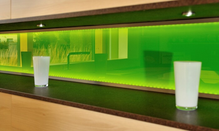 Eine schöne indirekte Beleuchtung entsteht in Küchenschränken mit Glastüren, die Sie durch den Einsatz von LED-Stripes illuminieren können. Diese schmalen Lichtbänder verbrauchen wenig Strom. Noch günstiger in der Anschaffung sind LED-Lichtschläuche, gut für den Bereich der Sockelleisten geeignet. Wenn Sie der Frühaufsteher sind, der sich oft morgens im Dunkeln seinen Kaffee macht, braucht es auch ein sanftes Licht für die Nische mit der Kaffeemaschine.