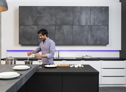 Der Trend zum Schwarz hält an und sorgt dafür, dass auch die Gerätehersteller möglichst viel schwarz gestalten, das früher noch silbern hervorblitzte: Ehemalige Edelstahlelemente werden entweder durch schwarze ersetzt oder weggelassen und kommen mit griffloser Gestaltung aus, bei der sich Gerätetüren durch Antippen oder auf Zuruf öffnen. Letzteres hilft, Fingerabdrücke zu vermeiden, denn gerade wenn die Ausführung in Schwarzglas erfolgt, werden sie störend sichtbar.
