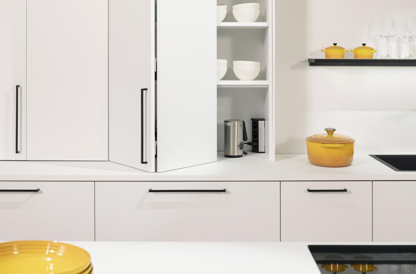 Falttüren zählen zu den neuesten Errungenschaften im Bereich Einbauküchen. Bislang hat man sie nur an Hochschränken gesehen, dabei zahlen sie sich genauso gut im Kleinformat an Aufsatzschränken aus, denn auch hier sparen sie enorm Platz beim Öffnen, da sie nur einen halb so großen Radius benötigen, wie die gesamte Tür breit ist.
