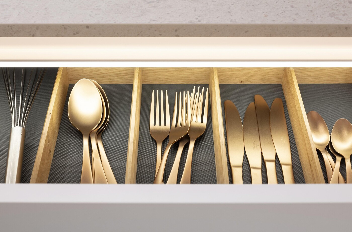 Goldene Details sind in der Interior-Welt derzeit sehr gefragt – von Lampen und Beschlägen bis hin zu goldenem Besteck. Dieses Goldbesteck besteht aber natürlich nicht aus massivem Gold. Stattdessen kommt Edelstahl zum Einsatz, der mit einer PVD-Beschichtung (Physical Vapour Deposition) oder einer Titan-Nitrid-Beschichtung versehen ist. Diese Hightech-Verfahren erzeugen eine dünne, extrem harte Schicht, die das Besteck nicht nur farblich veredelt, sondern auch kratz- und korrosionsbeständiger und spülmaschinentauglich macht.