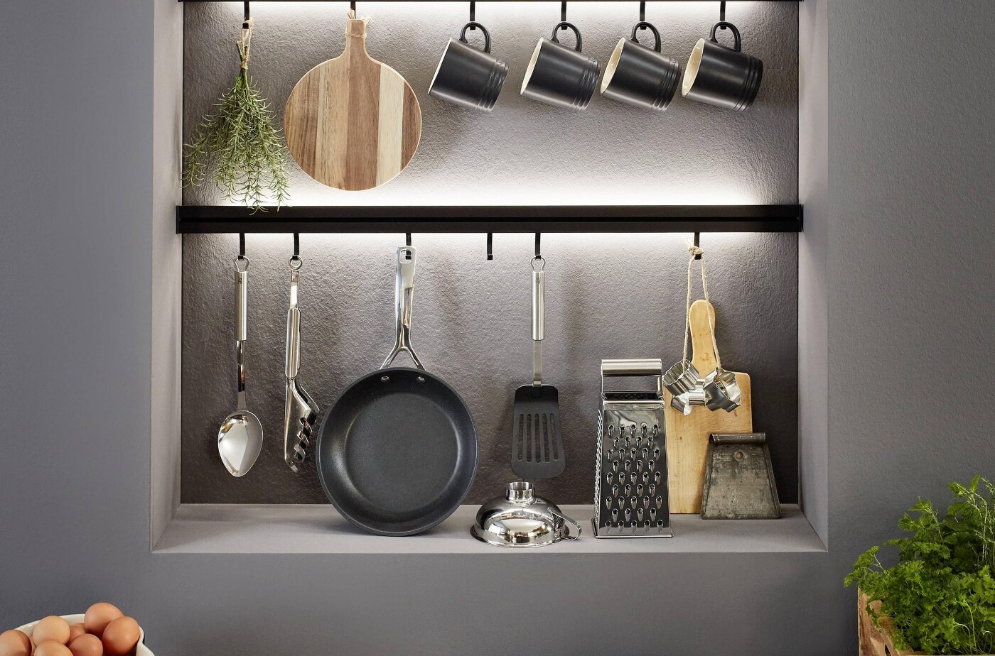 Auch bei den Reling-Systemen hat sich einiges getan, nicht nur in Bezug auf die Elemente zum Anhängen, Stellen oder Verstauen verschiedenster Küchenutensilien. Inzwischen kommen viele Wandstecksysteme mit indirekter LED-Beleuchtung, welche rück- oder unterseitig integriert ist.
