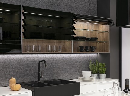 So eine L-Insel kann auch ein bisschen kompakter aufgebaut werden. Wenn Sie Feuer gefangen haben, kommen Sie einfach auf uns zu! Das gezeigte Beispiel der mattgrauen L-Kücheninsel zeigt, dass diese sich auch sehr gut für offene Küchen eignet: Die zum Wohnraum hin zeigende L-Seite wird mit Regaleinschüben versehen, in die man hübsche Gefäße stellen kann, was gleich eine wohnliche Atmosphäre verbreitet.