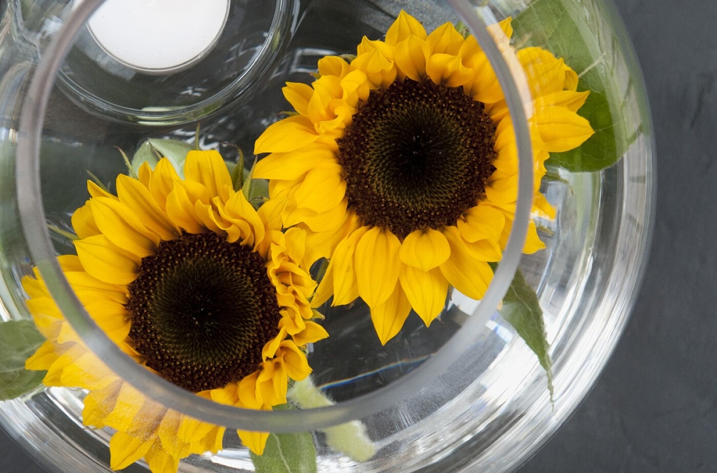 Sonnenblumen sind ein echter Hingucker. Haben Sie auch welche auf dem Balkon oder im Garten? Falls Wind oder Gewicht ihren langen Stiel abknicken sollte, retten Sie die Blüten doch in einem Goldfischglas oder einer schönen Schale. Füllen Sie Glas oder Schale dazu einfach zur Hälfte mit Wasser, legen Sie einige Kieselsteine hinein und lassen die Sonnenblumen-Blüten darüber treiben. Schwimmkerzen dazu, fertig. Das sieht wunderschön aus und ist auch dann eine Lösung, wenn für mitgebrachte Sonnenblumen keine ausreichend große Vase vorhanden ist!